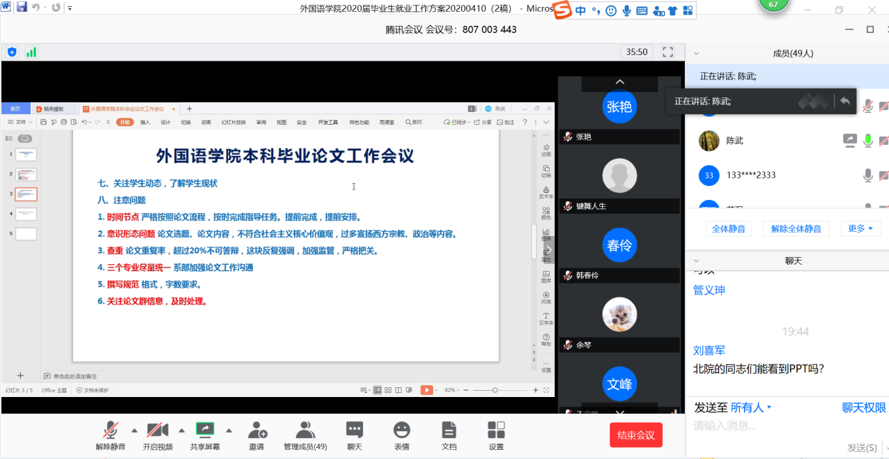 为了进一步做好学院2020届毕业生毕业论文和就业指导工作,外国语学院4月16日晚采用腾讯会议方式召开了学院2020届毕业生毕业论文暨就业工作推进会。学院党政领导、各系主管论文工作的主任、综合办公室主任、学生管理办公室主任、专兼职辅导员、教学秘书,全体研究生、本科生论文指导老师共50余人参加会议。会议由学院党委书记蔡强主持。