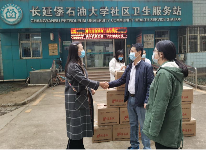 2020年3月28日下午,经济管理学院商务1801班贾欢煦同学在父亲的陪同下从咸阳来到学校捐赠疫情防控物资。国有资产处、校医院代表接收捐赠。