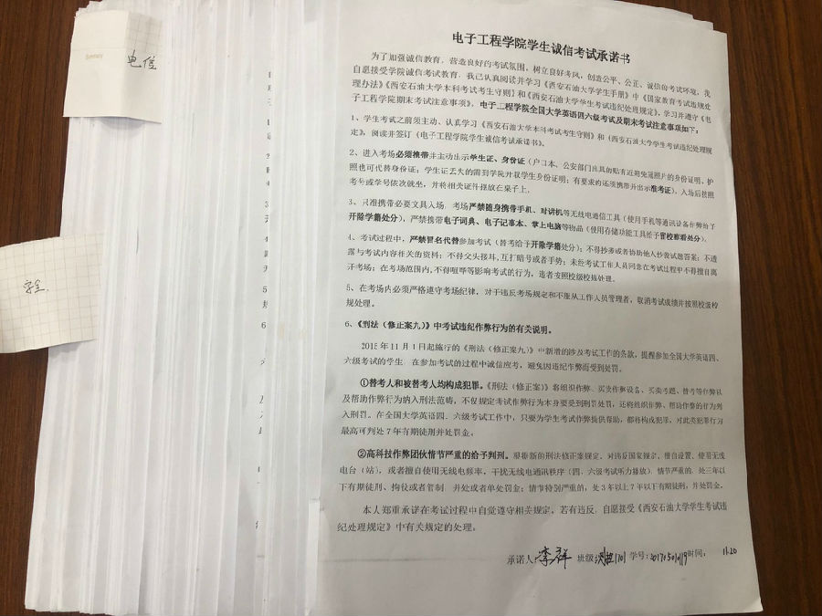 系列活动之签署诚信考试承诺书。为进一步加强学生诚信意识,将诚信考试落到实处,确保将考试相关纪律要求传达给每一名同学,坚决抵制作弊行为,各班级印制承诺书,组织各班级同学签署诚信考试承诺书,要求同学们谨记承诺内容,克服侥幸心理,自觉抵制作弊行为,力求达到教育广大学生诚信考试的目的,激发学生学习动力。