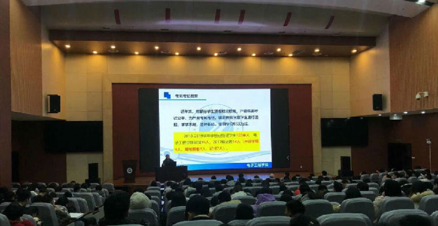 系列活动之召开学风考风推进会议。电子工程学院2017级辅导员高建邦分专业对学院2017级学生召开学风考风推进会议。高建邦老师首先对学生进行诚信教育,提高大学生的诚信应考意识,引导青年学生牢固树立守信光荣、失信可耻的道德观念。随后,高老师对考试纪律规定,违纪处分管理规定等方面做了详细介绍,并通报了近年来因作弊处分的学生情况,让同学们深刻认识到违反制度对自身发展的影响。