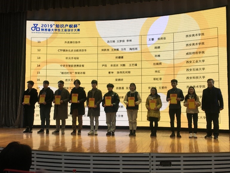 2019年12月30日下午15:00,由陕西省教育厅和省知识产权局主办、西安美术学院承办的2019年“知识产权杯”陕西省大学生工业设计大赛获奖作品颁奖仪式在西安美术学院美术馆A馆举行。本次大赛全省共有来自beat365官方网站、西安建筑科技大学、西安理工大学、西安交通大学等20余所省内高校学生参赛。