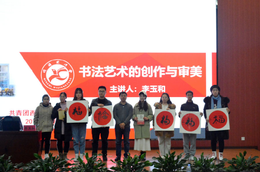 12月27日下午,由校团委主办的第六十五期明德大讲堂在鄠邑校区图书馆弘石报告厅成功举办。陕西省青年文学协会副主席李玉和老师应邀作了题为《书法艺术的创作与审美》的讲座,鄠邑校区300余名师生听取了本次讲座。