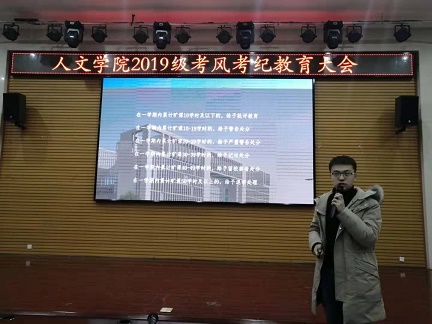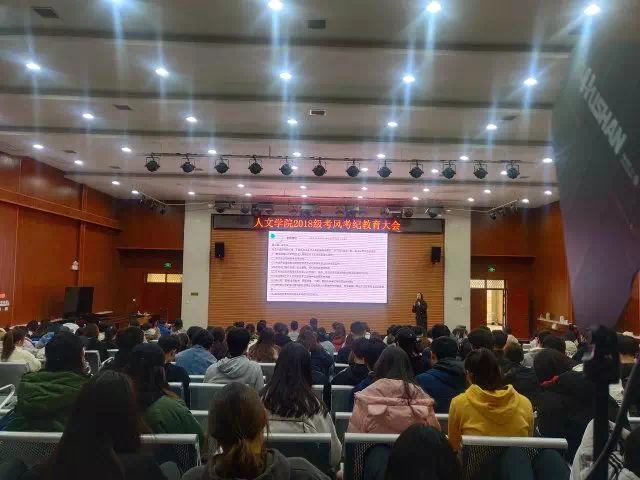 临近期末,为进一步营造良好的学习风气,维护安全和谐的学习和生活环境。2019年12月11日至13日间,人文学院2019、2018、2017、2016级分年级召开考风考纪教育大会。按照学校工作部署,人文学院各年级在年级大会中均对考风考纪工作提出要求,要求全院学生在即将到来的期末考试中严格遵守校级校规,严肃考场纪律,诚信考试。
