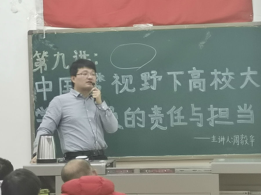 首先,周毅华老师为全体学员讲解了中国梦的内涵——实现中华民族伟大复兴,这是近代以来中华民族最伟大的梦想。他说,共产党一经成立,就把实现共产主义作为党的最高理想和最终目标,义无反顾地肩负起实现中华民族伟大复兴的历史使命,团结带领人民进行了艰苦卓绝的斗争,谱写了气吞山河的壮丽史诗。接下来,周老师讲述了中国共产党的发展历史和中国梦视野下高校大学生党员的责任与担当。自习近平总书记在参观复兴之路时第一次明确提出中国梦以来,中国梦一度成为社会舆论热议的话题,也成为国际社会关注中国的焦点。中国梦为我们勾画出了国家富强、民族复兴、人民幸福的美丽前景,是指引着党和人民前进的方向。当代大学生作为思维活跃、视野开阔、富有激情和创造力的高素质青年群体,是实现中国梦的主力军,肩负着实现中国梦的历史使命,大学生在实现中国梦的伟大事业中应当大有作为。