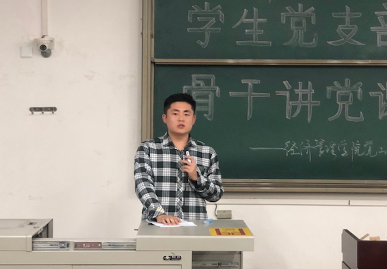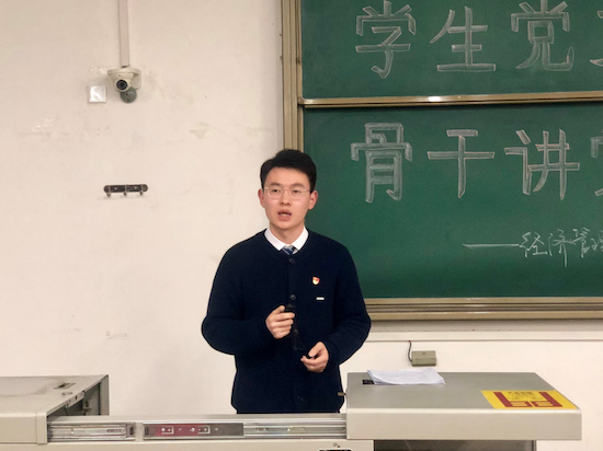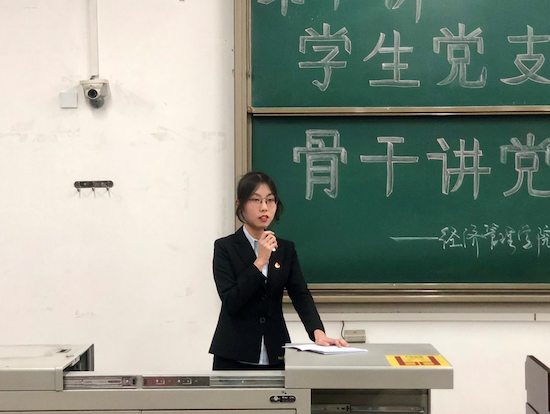 经济系学生党支部副书记丁子悦同志以《悟初心,守初心,践初心,做新时代优秀党员》为题第二个登场。他详细讲解了“什么是初心”、“坚持党领导一切的忠心”、“为人民服务的赤子之心”,以及“实现中华民族伟大复兴的信心”这四个方面,强调 “不忘初心、牢记使命”不仅是习近平总书记发出的伟大号召,更是处于新时代的青年党员所应该担起的责任。