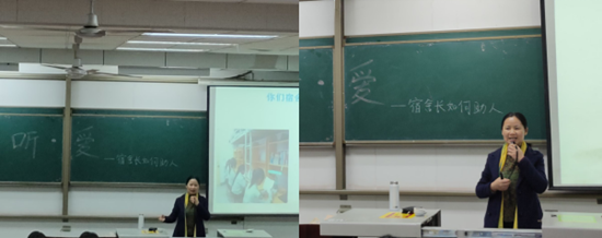 讲座开始,肖老师通过一个小测试,让各位舍长对自己宿舍的情况进行进一步分析:了解人与人之间的不同,每个人看待问题的方面不同;随后讲到,作为宿舍长要学会正确处理宿舍关系。再通过电视剧《小欢喜》的两个片段,告诉同学们要学会倾听,学会沟通,好的倾听可以表达尊重,促进表达;同时指出沟通中倾听是最重要的一部分,可以增加幸福感。最后,肖老师让同学们明白了沟通的目的和意义。
