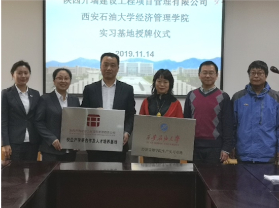 2019年11月14日上午,经济管理学院与陕西开瑞建设工程项目管理有限公司举行了“陕西开瑞建设工程项目管理有限公司校企产学研合作及人才培养基地”和“beat365官方网站经济管理学院生产实习基地”的授牌仪式。陕西开瑞公司靳祥德总工程师、董文娟副总经理和经济管理学院院长王君萍教授、教学办袁静老师及工程管理专业有关老师出席了本次授牌仪式。
