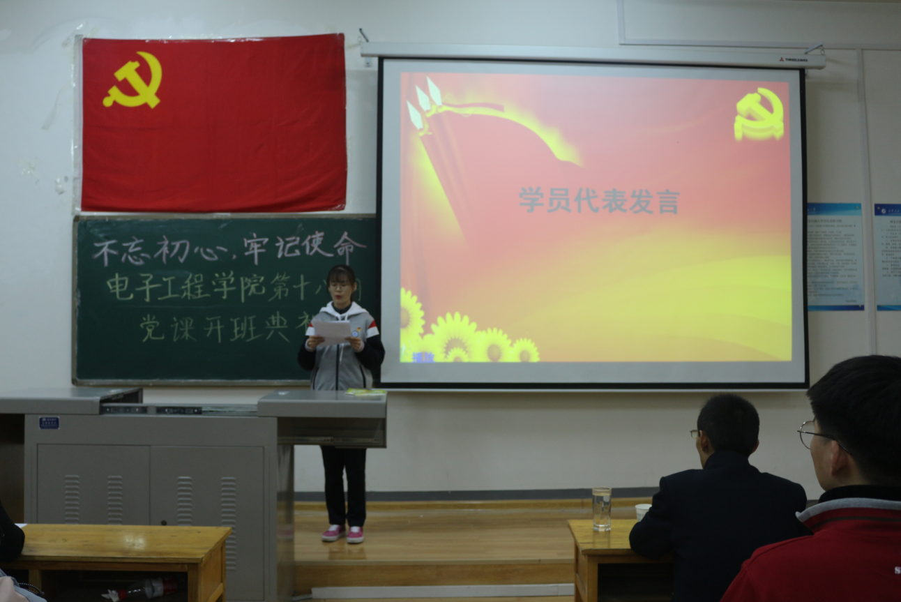 开班典礼在悠扬的国际歌声中正式拉开帷幕。首先,由上期优秀学员代表测控1802班的东怡同学和本期学员代表测控1903班刘东瓒同学进行发言,他们的发言充分展现了入党积极分子们良好的精神风貌,以及积极向党组织靠拢的决心。随后,由学生管理办公室主任、团委书记周毅华宣读了党课纪律要求,对参训学员做出了严格的要求。最后,由电子工程学院党委副书记毕轶慧老师致辞,“学有所思,思有所得”是毕老师对学员的一种要求,也是一种期盼。