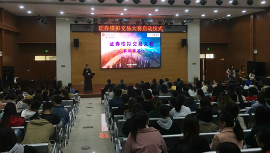 吴勋副院长在致辞中结合教育部召开的新时代全国高等学校本科教育工作会议的精神指出,全面提高高等教育质量,本科教育至关重要,本次大赛的启动就是要给我院大学生合理“增负”,这不仅有助于同学们做到知行合一,将理论知识转化为实践能力,也有助于我院的专业建设和学科发展。王天福副总经理在讲话中指出,本次大赛旨在为拟参与证券投资的同学搭建一个模拟证券交易的平台和环境,进行专业知识教育和模拟交易,帮助同学们尽快熟悉证券交易规则,为后续的学习和工作打下良好基础。赵海涛副书记宣布证券模拟交易大赛正式启动。