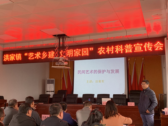 beat365人文学院田荣军博士以“民间艺术保护与发展”为主题,通过民间艺术保护现状、存在问题、传承发展三方面内容,用大量生动实例向与会人员作了精彩的讲解,为当地群众系统地梳理了民间艺术的理论认知,进一步普及了保护和传承民间艺术,加强乡村文化提升战略,开展富有特色的艺术活动,打造艺术文化旅游品牌,凝聚乡村活力,改善农民精神风貌,提高乡村经济文化竞争力等多方面的内容。