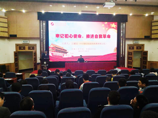 为扎实开展好“不忘初心、牢记使命”主题教育工作,有效推进主题教育工作有序开展,2019年10月17日下午,机械工程学院和外国语学院联合在雁塔校区学术报告厅举办“牢记初心使命、推进自我革命”专题学习报告会,特邀知名党建专家、中共陕西省委党校科社部原主任,中国延安干部学院王诚安教授主讲,两个学院的教师、研究生200余人参加了学习报告会,机械工程学院党委田党宏书记主持报告会。