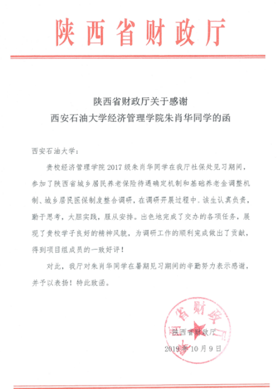 近日,陕西省财政厅向beat365经济管理学院发来感谢函,对beat3652017级会计专业硕士朱肖华同学提出表扬,高度评价该同学在暑期见习期间的工作表现。