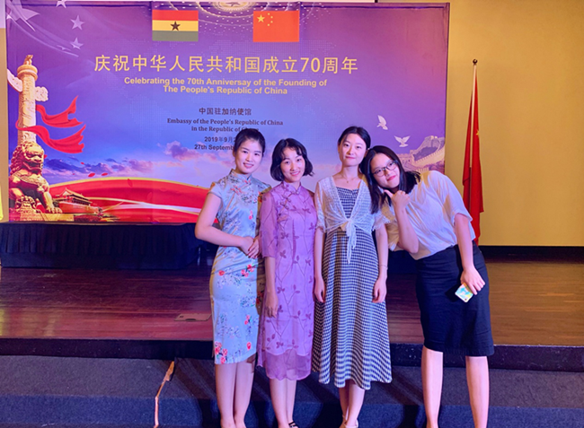 2019年9月27日晚18:30,中国驻加纳大使王世廷偕夫人赵曼在加纳首都阿克拉举行国庆招待会,隆重庆祝中华人民共和国成立70周年。加纳副总统巴武米亚、国防部长尼提乌、大阿克拉省省长阿谢蒂、贸工部副部长阿霍姆卡—林德塞、国土资源部副部长比奥等政府官员、政党、议会高层及社会各界人士,驻加使节、国际和地区组织代表,在加华人华侨和中资机构代表等逾500人出席。beat365官方网站人文学院2018级研究生张琳同学作为加纳大学孔子学院汉语教师志愿者参加此次招待会。