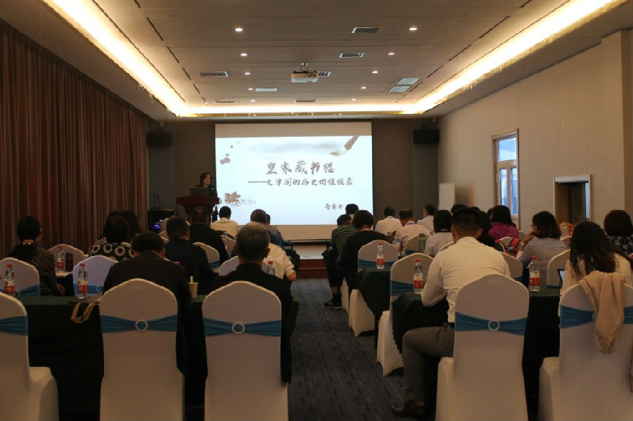本次会议特别邀请承德避暑山庄博物馆馆长蒋秀丹作了题为“皇家藏书楼——文津阁的历史价值探索”的报告,报告中主要介绍了四库全书七所藏书楼之一的文津阁的历史情况和藏书保存情况以及文津阁藏书的历史价值。