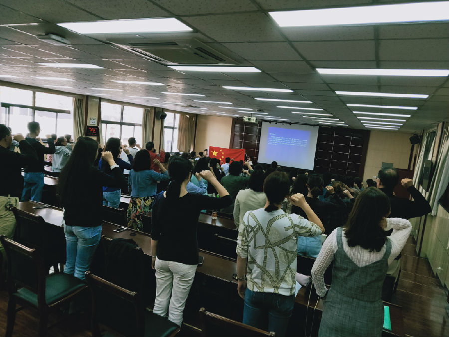 会议首先安排进行了教师集体宣誓仪式。宣誓仪式由蔡强书记领誓,学院领导、全体教职工110余人全体起立,右手举拳,面对国旗庄严誓言,郑重承诺履行教师职责,牢记人民教师职业初心与光荣使命。通过宣誓活动,全体教职工进一步提升了服务国家、献身教育的思想意识,增强了作为一名人民教师的职业荣誉感和社会责任感。
