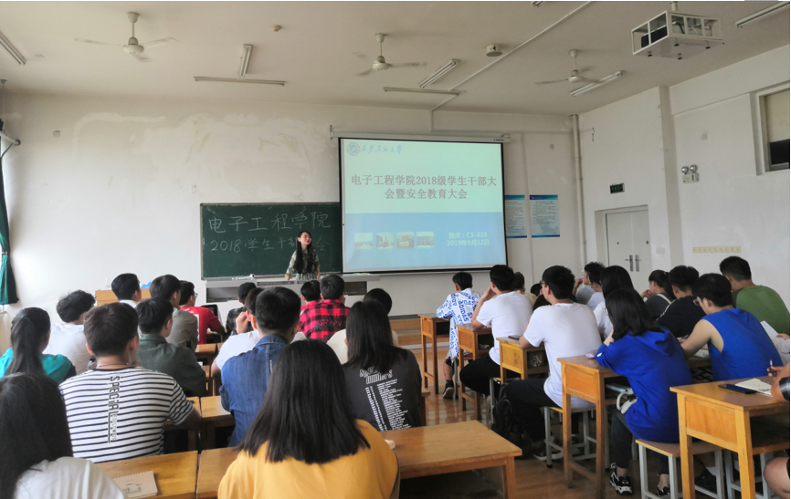 2019年9月12日中午,电子工程学院在C3楼419召开了2018级学生干部大会暨安全教育大会,会议由电子工程学院2018级辅导员老师钱宇航主持,2018级全体学生干部参加了本次会议。