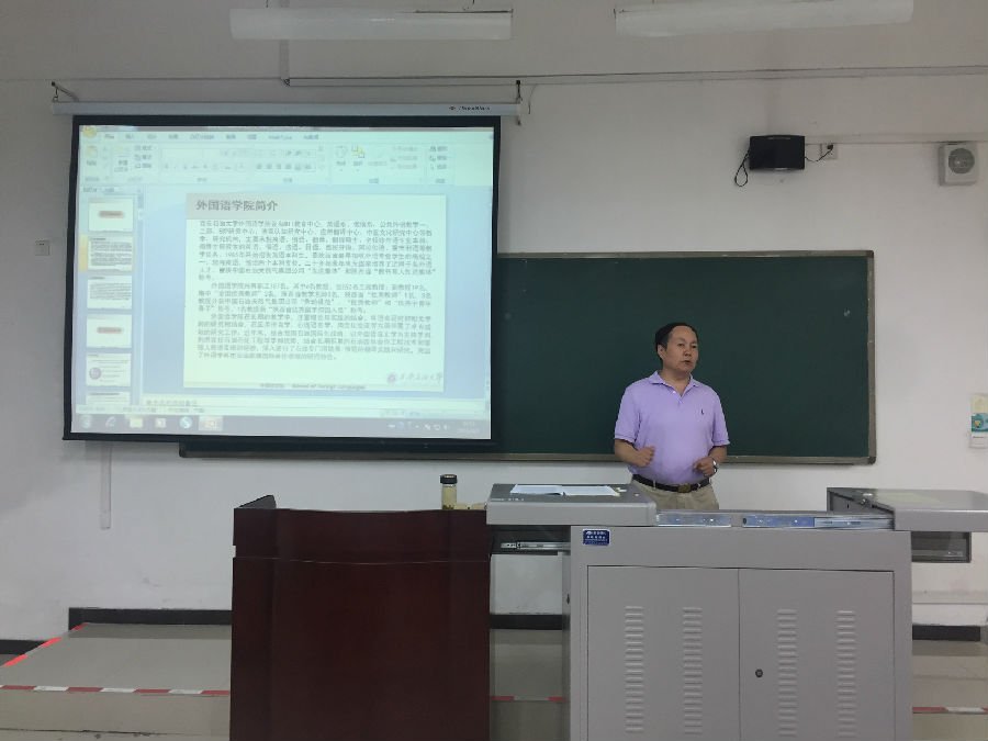 外国语学院院长于艳英教授从学院的发展 历程讲起,向同学们介绍了外国语学院的基本情况,之后学院党委副书记王业青强调了研究生日常教育管理制度,明确了请假及宿舍管理的有关规定。