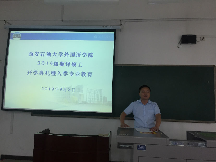 9月13日下午,外国语学院2019级翻译硕士研究生开学典礼暨入学专业教育在鄠邑校区A201教室隆重举行。外国语学院党政领导班子全体成员、翻译硕士研究生导师和2019级翻译硕士研究生参加开学典礼。
