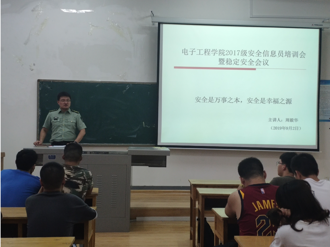 2019年9月2日晚19:00,电子工程学院在C3楼419召开了2017级安全信息员培训会暨稳定安全会议,会议由电子工程学院学生管理办公室主任兼2017级辅导员周毅华主持,2017级辅导员高建邦、2017级全体学生干部及宿舍长参加了本次会议。