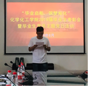 应化1502班姚思宇代表学院2019届毕业生在发言向悉心培育自己的母校、亲爱的老师和家长们致以最崇高的敬意和最诚挚的谢意,表示今后将永远铭记母校给予的精神财富,懂得责任担当,学会脚踏实地,永怀青春朝气,勇于开拓进取,永不言败,砥砺前行,争取以优异的成绩回馈母校和社会。