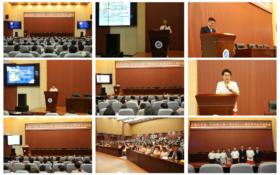 6月13日下午,理学院在鄠邑校区弘石学术报告厅举办“易逝的青春、闪光的足迹——优秀毕业生报告会”。 2019届优秀毕业生沈霈、曾献清、潘柯成、李晓爽、宋晓楠、臧红旭六名同学先后作报告,学院党委副书记马小刚出席,辅导员周新怡主持,理学院2016、2017、2018级全体同学参加。