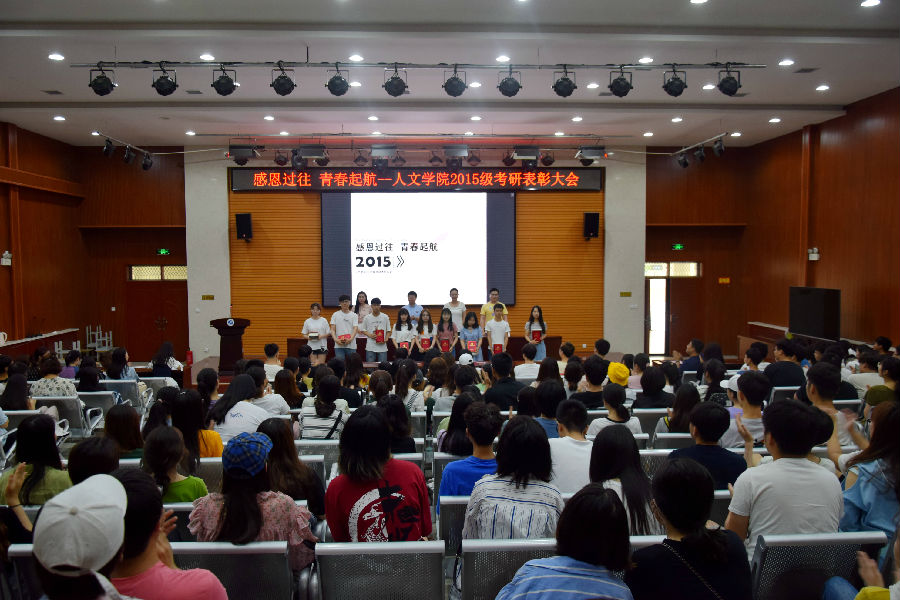 大会宣读了《人文学院关于对2015级学生考研成绩进行表彰的决定》,对2015级考研成绩突出的54名同学进行了表彰。通过全院师生的共同努力,2019年报考研究生考试的学生的人数为114人,占2015级全年级总人数44.5%,上线人数达54,占全年级人数21.6%,最终32名同学被心仪高校录取,整体录取率较去年增长5个百分点,增幅名列全校各院系第三。
