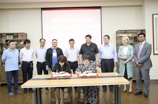 2019年5月27日,beat365官方网站经济管理学院院长王君萍、财务处副处长聂朝恩及教师陈丁前往西安博爱国际学校,就共建优秀生源基地等事宜与王国平董事长、南国庆监事长、陈红校长、国际部Nancy主任进行座谈并达成共识,双方签约共建“优秀生源基地”,并举行授牌仪式。