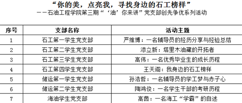 为全面学习贯彻党的十九大精神,深入贯彻落实习近平新时代中国特色社会主义思想,按照新时代党的建设的总要求,推动全面从严治党向基层延伸,进一步增强支部书记抓好党建工作的责任意识,激发基层党支部活力,切实提高学院党建工作质量,石油工程学院组织开展了“‘油’你来讲”——学生党支部创先争优活动,目前进行到第三期。