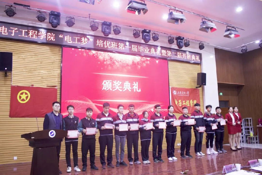 3月20日晚,电子工程学院“电工梦”培优班第一届毕业典礼暨第二届开班典礼在鄠邑校区人文经管楼118举行。电子工程学院党委副书记毕轶慧、学生辅导员梁琦、黄景鹏、第一届培优班优秀学员代表以及本届学员共计111人参加。