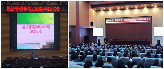 新学期,新气象,经济管理学院于3月13日12点30分别在鄠邑校区弘石报告厅和就业指导中心118召开2018级年级大会。会议分别由2018级学生辅导员尹晓娇、陆晓寒老师主持,2018级全体同学参加了会议。