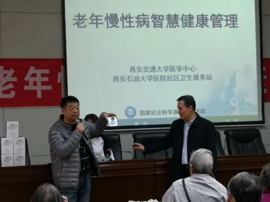 讲座结束后,西安交通大学医学中心的工作人员现场对高血压智慧健康管理项目进行了详细介绍,通过在医院社区卫生服务站建立电子档案并检测血压波动,享受交大一附院专家远程诊疗及转诊,方便离退休职工对高血压的监测,提高自我管理能力和生活质量,这也是校医院社区居民慢病管理的新的举措。