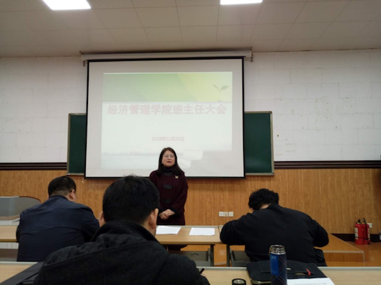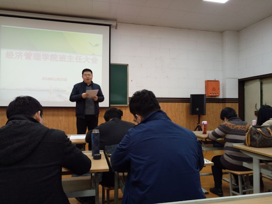 为进一步做好立德树人工作,提高管理学生和服务质量,增强班主任之间的交流,经济管理学院于2018年12月25日在雁塔校区第二教学楼东阶101召开全院班主任大会。学院党委副书记赵海涛主持,全体班主任及全体学工干部参加了会议。