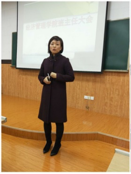 接下来,2016级班主任代表袁静老师分享了她作为营销1601班班主任的心得。袁老师从营销专业的学生构成讲起,为了提高学生的自信心,她两周开一次班会,亲自设计班徽班服班训,并通过细心观察主动帮助家庭经济困难的学生,鼓励学生参加学科竞赛。通过一学期的努力,营销班学生的精神面貌有了很大的改观,成绩也进步很大,袁老师感悟要用父母的心态,用真情对待学生。