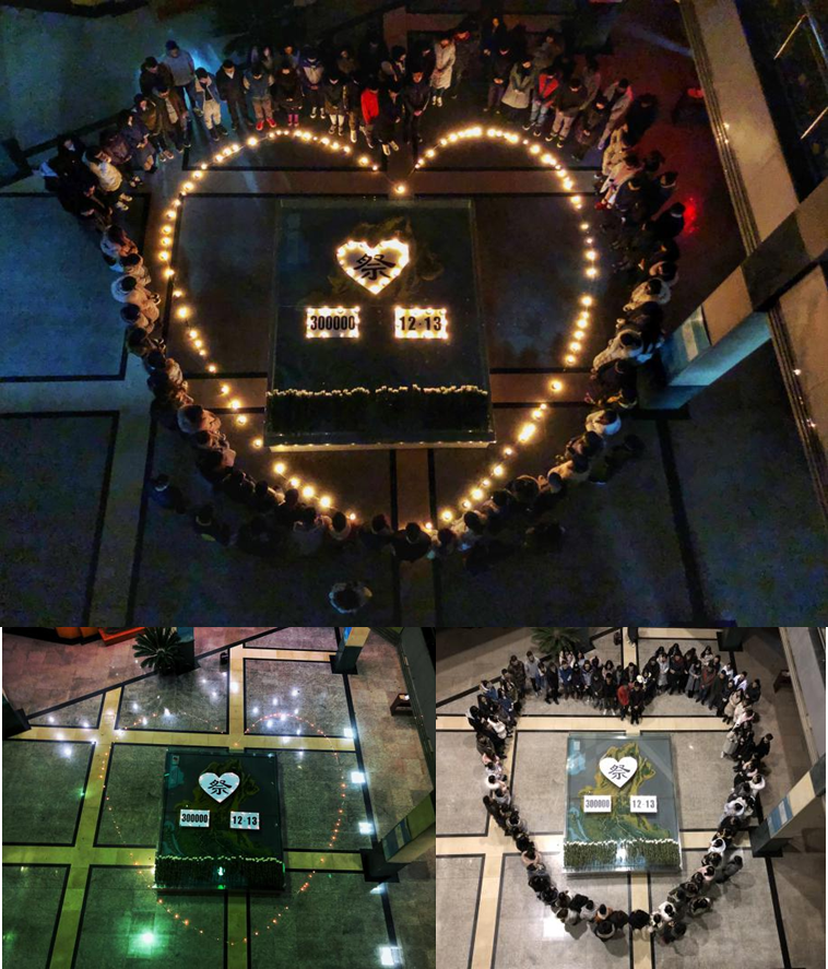 在“悼念同胞烛光祭”活动中,师生们点燃烛光摆放成“心”的形状,里面是“12•13”国家公祭日日期以及南京大屠杀死难者人数“300000”字样。师生们集体为南京大屠杀遇难同胞默哀,献花,敬烛,表达无限哀思和缅怀。