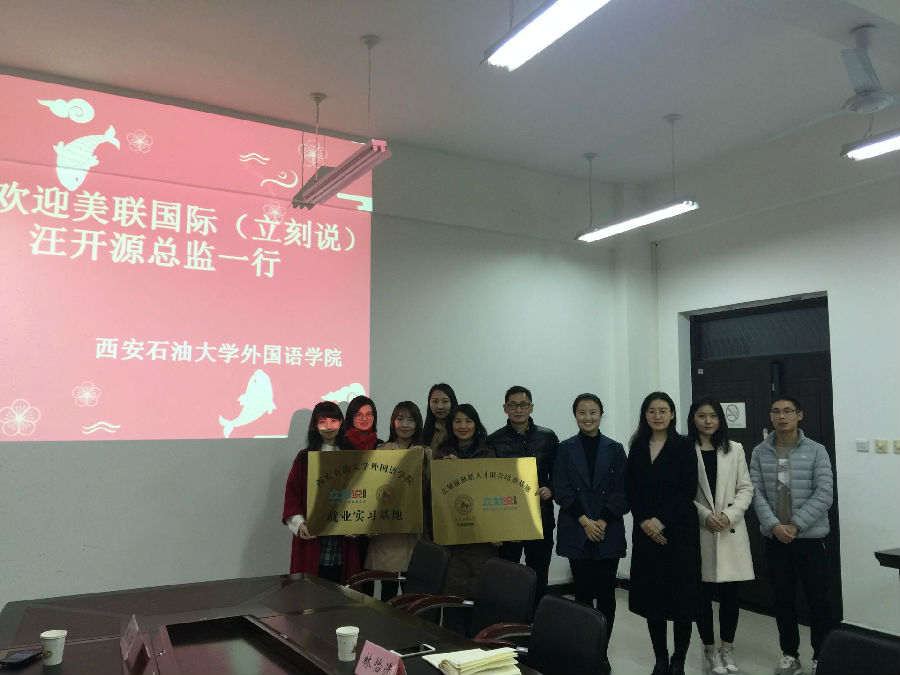 2018年11月15日早上11点,外国语学院与美联国际教育(立刻说)实习就业基地挂牌仪式在鄠邑校区人文经管楼318举办。挂牌仪式由学管办主任蒋曙光老师主持,参与此次挂牌仪式的领导老师有外国语学院党委书记廖敏、立刻说首席总监汪开源、立刻说教学经理邓松林和外国语学院全体辅导员老师。