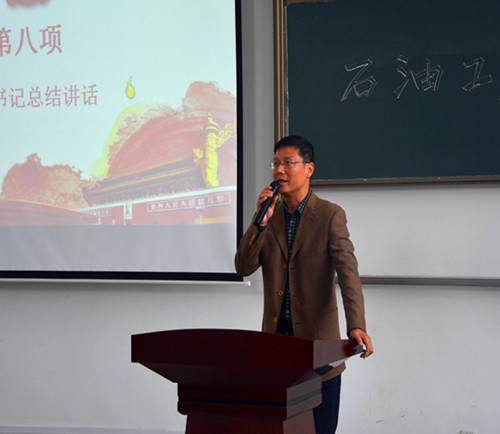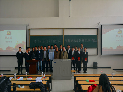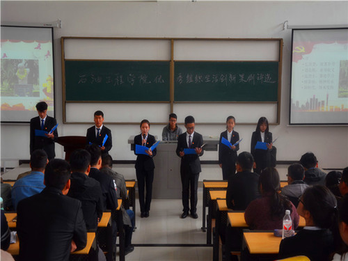 为深入学习贯彻习近平新时代中国特色社会主义思想和党的十九大精神,落实全国高校思想政治工作会议精神,进一步推进“两学一做”学习教育常态化制度化,响应学校要求,推动我院学生党支部建设,提高学生党支部组织生活的质量和效果,增强学生党支部的创造力、凝聚力和战斗力,石油工程学院党委于2018年10月24日中午12:30在鄠邑校区石工地科楼115教室举行了学生党支部优秀组织生活创新案例评选活动。学院党委书记马勇、党委副书记张建高、党委组织委员孙会珠、化学化工学院党委兼职组织员屈敏佳、经济管理学院党委兼职组织员武威受邀参加并担任评委,学院全体辅导员及130余名学生党员也参加了活动。