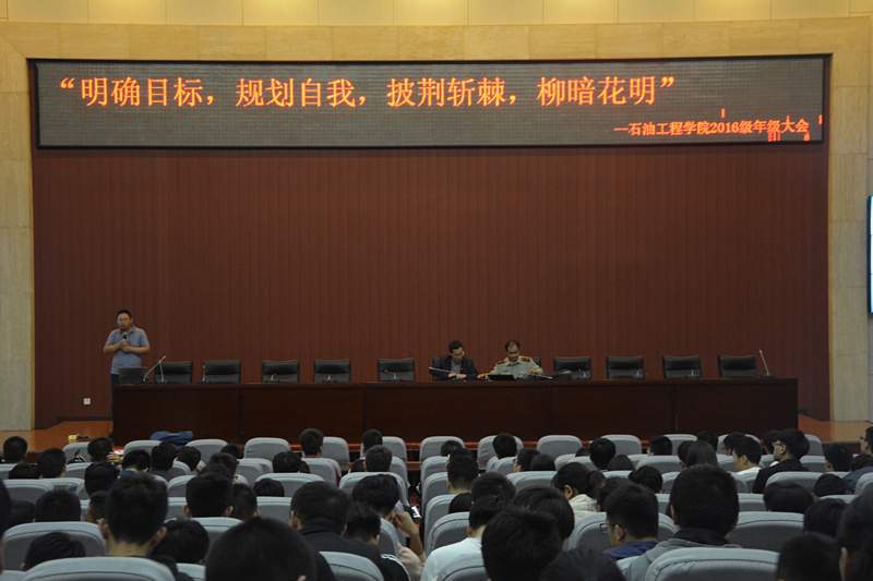 9月19日晚,石油工程学院2016级年级大会在弘石报告厅举行。本次大会的主题为“明确目标,规划自我,披荆斩棘,柳暗花明”。石油工程学院党委副书记张建高、学生管理办公室主任孙会珠、2016级辅导员老师严维博及2016级全体同学参与本次会议。