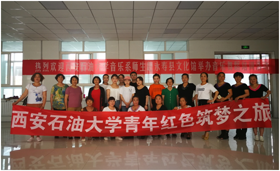 为全面贯彻落实习近平总书记回信精神,在校工会联系下音乐系与永寿县文化馆开展结对子活动,引导青年扎根大地,了解国情、民情,助力教育扶贫,实现文化惠民。6月29日~7月2日为永寿县文化馆开展舞蹈、音乐培训活动。何云老师、张萌萌同学精心准备了适应不同年龄段人群的藏舞、现代舞和拉丁舞;甘璐瑶等同学为永寿县声乐爱好者从呼吸、发声、演唱技巧和乐理知识等方面进行指导。本次活动有近150名文艺爱好者参与,充分彰显了我系的专业优势,提升师生的实践能力,发挥音乐育人的作用,将艺术实践与教育扶贫相结合,促进了永寿县基层文艺队伍建设。