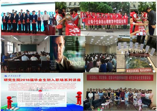 ——促进工作,坚持融合。在开展专题学习和落实三会一课制度中,研究生院党委坚持以促进工作,学做融合为原则,要求研究生党建工作为研究生学术实践和稳定安全教育提供思想保证和动力支持。2018年5月至今,在各研究生党支部积极带动,研究生党员模范带头下,研究生院超额完成互联网+创新创业大赛报名工作,研究生在石油装备创新设计大赛、研究生电子设计竞赛、陕西省研究生创新成果展报名积极,并石油工程设计大赛等学科竞赛中获得全国二等奖2项、三等奖3项。在稳定安全教育中,充分发挥党支部战斗堡垒作用和研究生党团骨干作用,结合研究生在学习生活中关注的热点难点,开展研究生宿舍管理服务专题座谈会;结合“525心理健康教育月”,开展宣传倡议、印发手册、现场咨询、科普展览、电影评析、问卷调查、主题讲座等系列活动;结合毕业生文明离校,开展毕业生初入职场系列讲座、毕业篮球赛、毕业生党员座谈会、主题征文等,进一步强化党员身份意识,宗旨意识,切实增强党员荣誉感,责任感,使命感,为进一步加强研究生思想政治教育和积极推进研究生党建工作做出自身更大的贡献。