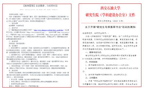 ——组织慕课,导师助力。为进一步落实《高校思想政治工作质量提升工程实施纲要》任务,深入推进文化育人,营造良好学习氛围,研究生院党委于2018年5月在广大研究生中开展“礼敬中华优秀传统文化,弘扬社会主义核心价值观”MOOC学习活动和导师推荐书目活动,一方面有助落实研究生导师立德树人职责、形成全员全过程全方位育人格局,另一方面有助于在广大研究生中形成浓郁读书氛围,引导研究生感悟阅读的力量、享受阅读的乐趣、领悟阅读的美好,在阅读中获得前行的力量、感受温暖的慰藉、滋养善良的心灵、成为有趣的灵魂。