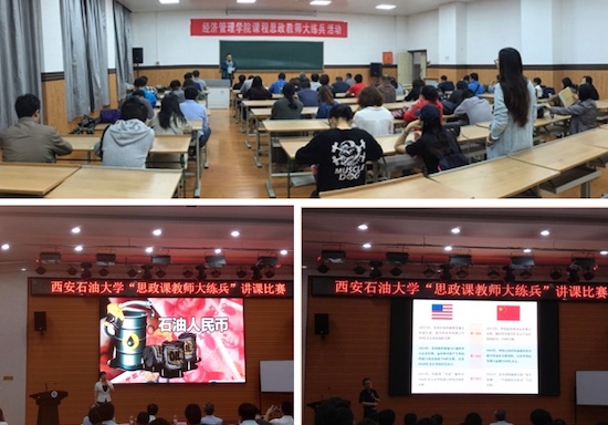 ——马克思主义进课堂。5月9日,经济管理学院组织进行了“课程思政教师大练兵教学观摩活动”,既为学生教授了丰富的专业知识,又潜移默化地传播了正确的价值观、世界观,丰富了课堂。石冬莲老师以主讲课程《国际金融》中“国际货币体系”部分为对象进行了讲述。她结合国际、国内时政要点,对“石油美元”历史、现状及预期等热点问题进行了精彩纷呈的讲解。董春诗老师以主讲课程《宏观经济学》中“国民收入核算体系—GDP”部分为对象进行了讲述。董老师把一组组详实的数据和我国的经济发展历程结合起来,使学生从数据中清晰地看到新时代的到来、新时代的特色和新时代的要求,董老师的讲述使数据变得鲜活,课堂充满了激情。两位老师代表经济管理学院参加了6月5日在鄠邑校区经管人文楼118室举办的校级“思政课教师大练兵”讲课比赛,包揽前两名,并取得了参加省赛的资格。