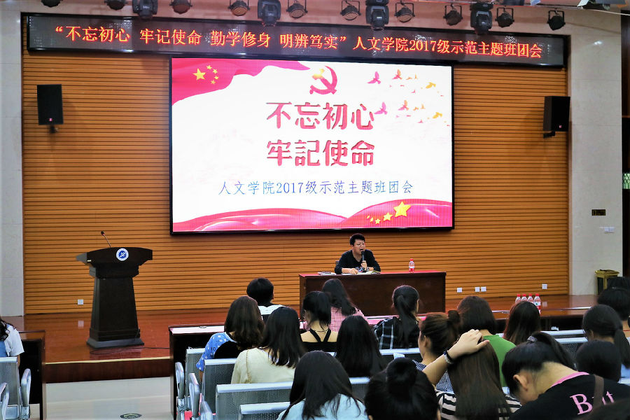 为深入学习习近平总书记在北京大学师生座谈会上及纪念马克思诞辰200周年大会上的讲话,加强大学生日常教育与管理服务工作。2017年5月23日晚,人文学院2017级在鄠邑校区经管人文楼就业指导中心多功能厅召开以“不忘初心、牢记使命、勤学修身、明辨笃实”为主题的示范主题班团会暨年级大会。会议由辅导员文爱国主持,2017级全体学生参会。本次会议围绕两部分展开,一是理论学习与分享,二是工作布置与安排。