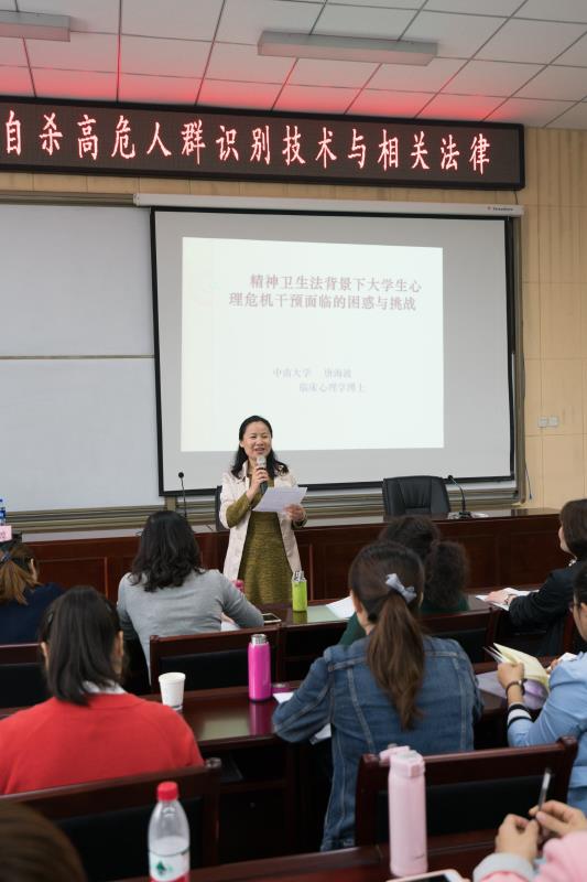 8日上午,唐教授作了题为《精神卫生法背景下大学生心理危机干预面临的困惑与挑战》的专题讲座。他结合自身丰富的临床实践经验,将《精神卫生法》中与高校学生工作相关的条款进行了深度解读,阐述了在《精神卫生法》的指导下,如何有效开展大学生心理危机干预工作,并且介绍了如何在法律规范下对心理异常学生进行干预、送诊、转介以及处理休学和复学等工作的相关注意事项。