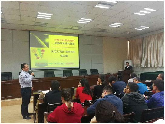 本次报告会由李华副校长主持,邹院士以“光催化材料的研究——面临的机遇与挑战”为主题做了大会报告。邹院士在报告中指出:中国既是能源短缺国,又是能源消耗大国。石油、煤炭、天然气等化石能源的过度消耗加剧了环境污染,尤其是近年来雾霾天气频繁出现,严重影响了人民的生活和身体健康,因此研究光催化太阳能转换与利用对优化我国能源结构具有重大意义。邹院士对光催化材料的现状、未来,及其在光催化领域的最新研究进展做了详尽的介绍。邹院士报告会语言风趣幽默、通俗易懂,以及他与大家分享的个人心路历程,令人敬佩。学术报告会接近两个小时,在收场时分,全体人员热烈鼓掌,为邹院士的精彩报告喝彩。