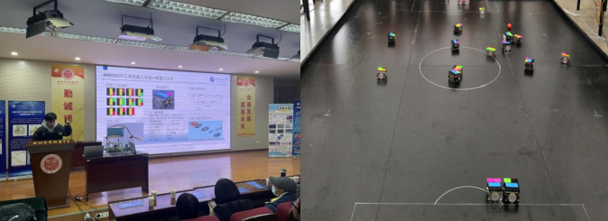 半自主足球机器人软件系统展演将整场科技活动推向了高潮。参展同学介绍了中国机器人大赛项目分类,这是一个极富挑战性的高技术密集型项目,重点围绕半自主项目机器人小车、摄像装置、计算机主机和无线发射装置开发的软件系统进行了精彩讲述,告诉同学们基础学科的理论知识非常重要,它们在视觉系统判定机器人与球在场地的位置方向,决策系统判断机器人攻守姿态中应用广泛。当播放参赛实况视频时,在场师生被瞬间带入紧张激烈的RoboCup机器人世界杯比赛现场,一同感受盛大的国际机器人竞技盛宴,中学师生不时传来阵阵赞叹声和惊呼声。当展示同学介绍到,学校足球机器人团队18年来荣获国家级奖项100项以上,2023年10月荣获2023中国机器人大赛FIRA小型组半自主赛项冠军1项、亚军1项,中央电视台新闻频道播放了beat365参赛团队决赛的精彩片段时,场下的中学师生响起雷鸣般的掌声。