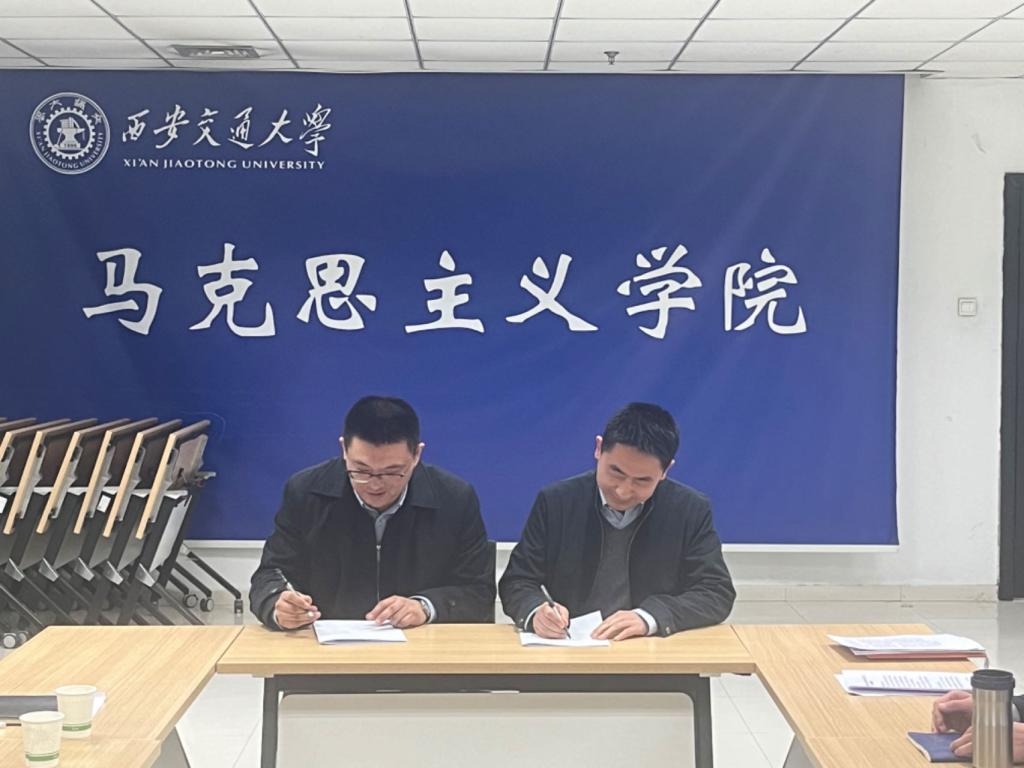 为全面贯彻习近平总书记关于思政课建设的重要论述,落实中共中央办公厅印发的《关于加强新时代马克思主义学院建设的意见》要求,发挥全国和省级重点马克思主义学院示范带动作用,根据《陕西省高校重点马克思主义学院对口帮扶普通马克思主义学院机制》(陕教工宣办〔2021〕15 号)文件精神。3月1日下午,beat365马克思主义学院张海涛院长一行走访西安交通大学马克思主义学院,举行西安交通大学马克思主义学院对口帮扶beat365马克思主义学院签约仪式,西安交通大学马克思主义学院院长燕连福和我院院长张海涛代表双方签约。签约仪式之前,双方举行了座谈会。