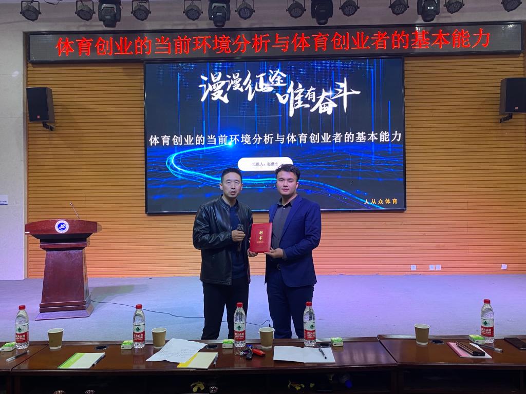讲座结束后,李寿邦院长代表学院对赵世杰董事长的精彩演讲表示感谢,并为其颁发聘书,聘任赵世杰董事长为体育学院校外实习指导教师和创新创业导师。他强调,同学们要不断开阔视野和提升自我,拓宽创新创业活动思路,勇于接受挑战;要利用所学知识更好地规划自身发展,明确自身目标,积极参加创新创业竞赛,切实提升自身创新创业能力,积极投入到创新创业的浪潮之中。