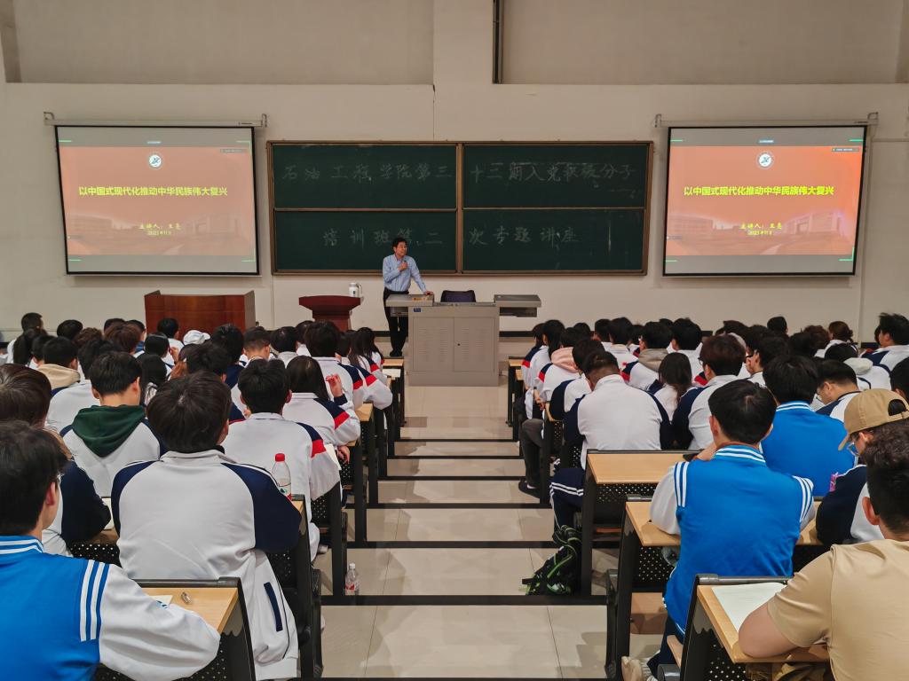 3月14日晚19:00,石油工程学院第三十二期入党积极分子培训班第二讲在石工地科楼115教室顺利进行。beat365官方网站学生工作部(处)部(处)长、就业指导中心主任王亮作了题为“以中国式现代化推动中华民族伟大复兴”的党课培训。本次党课线上线下同步进行,石油工程学院共计200余名参训学员参加了此次培训。