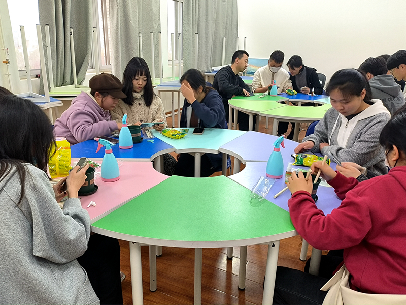 活动中,同学们三人为一组,每组选择自己想种植的花草进行并交流讨论。软件工程2201班心理委员张圣月为大家讲解了与大自然有关的心理健康知识,引导学生关注自己的内心情感,倾听心灵声音。活动还设置了创意花草手工制作环节,让同学们动手亲自制作花束和盆景,在细致的操作中,感受一花一世界的意趣,提高人际交往和沟通协调能力,不断提升心理健康水平。