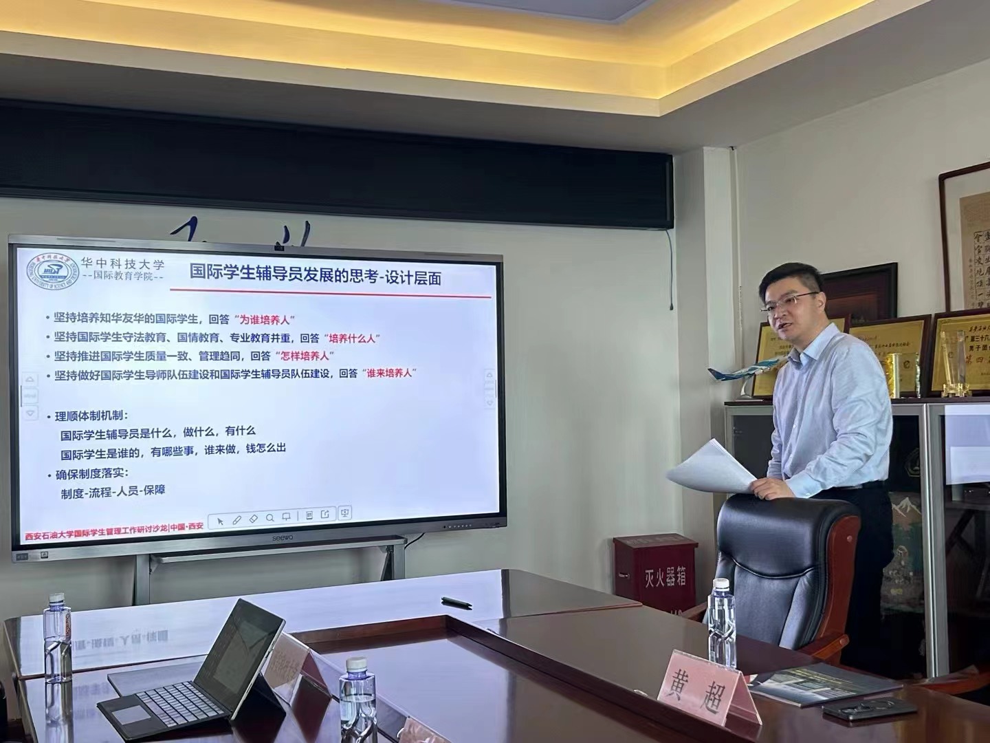 3月26日下午,国际教育学院在雁塔校区东方石油楼801会议室举办国际学生管理工作研讨沙龙。此次研讨沙龙第一讲邀请了华中科技大学国际教育副院长黄超博士作专题讲座和经验交流。国际教育学副院长颜庭星主持会议,中国地质大学(武汉)、西北大学、西安科技大学、西北政法大学等兄弟高校国际教育学院副院长、留管干部及学院全体国际学生辅导员参加此会议。